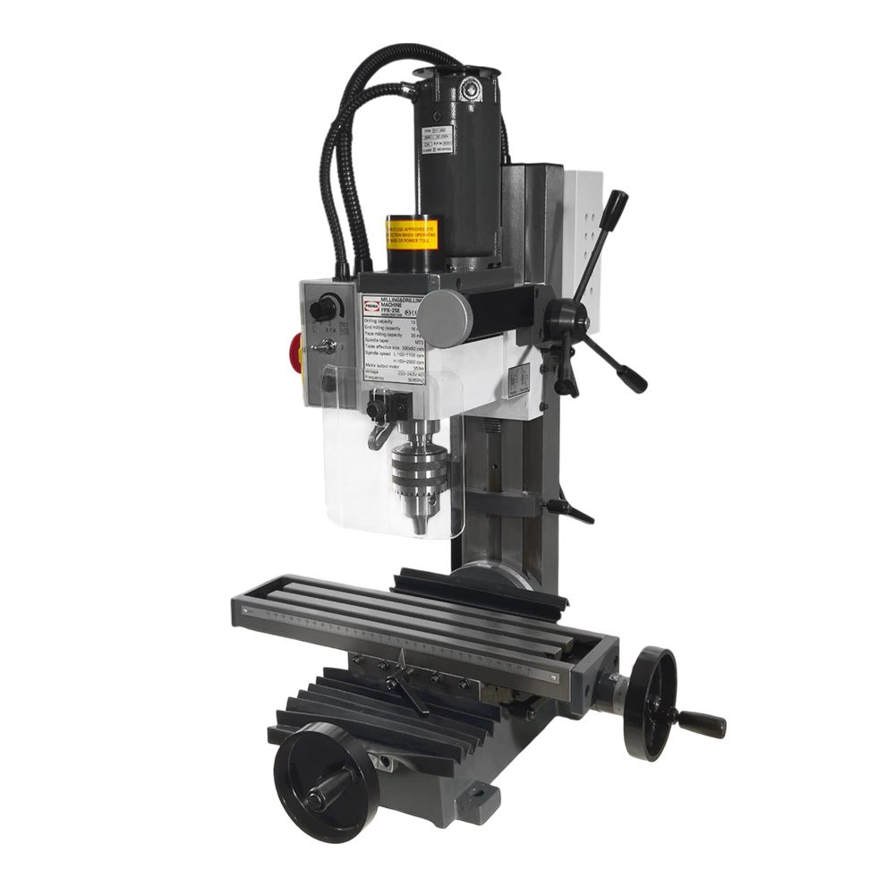 FPX-25 E- это настольный вертикально-фрезерный станок. Он предназначен для обработки лёгких и небольших деталей или корпусов из различных материалов в условиях мелкосерийного производства, а также в домашних мастерских, благодаря малым габаритам, низкому потреблению мощности и возможности подключения к бытовой сети.Из достоинств следует отметить вертикальную тонкую подачу и плавную регулировку оборотов, которые обеспечивают максимальную точность и качество обработки детали. Есть и другие достоинства. Например: возможность установки фрезерной головки под углом вправо или влево. Рабочий стол из чугуна оснащен Т-образными пазами для крепления дополнительных приспособлений или заготовки.