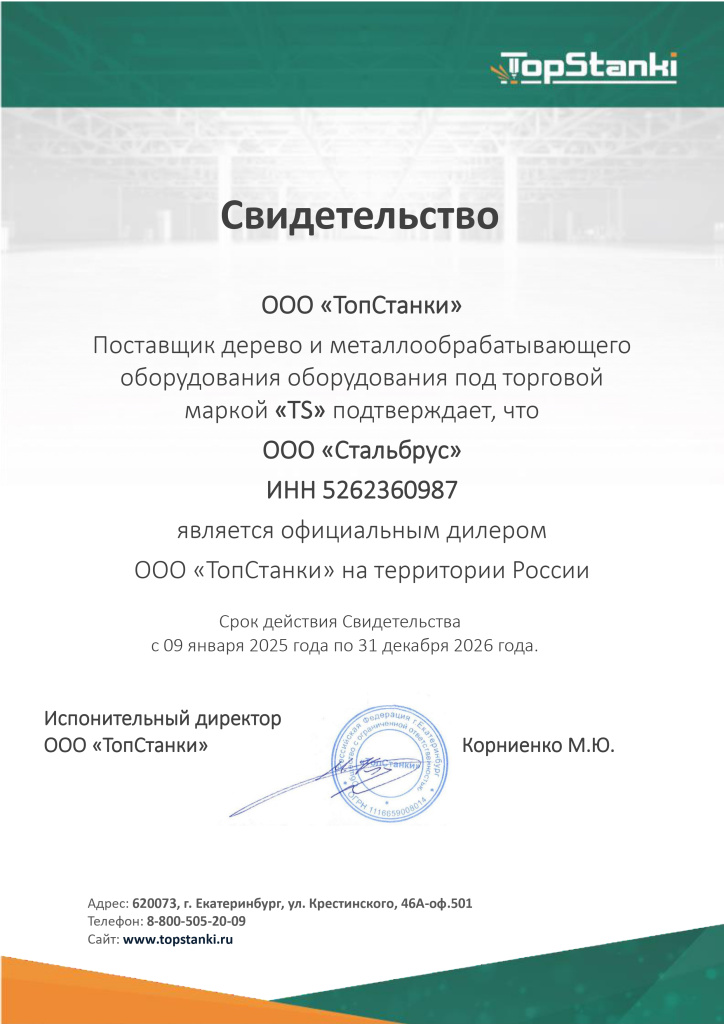Сертификат дилера TopStanki